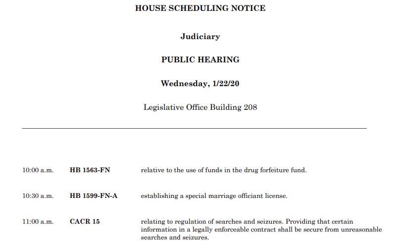 Yesterday I had the opportunity to testify before the New Hampshire House Judiciary Committee in favor of CACR15, a proposed constitutional amendment I wrote along with Rep. Josh Yokela. The amendment would restore crucial Constitutional protections for individuals while, at the same time, preserving government’s ability to engage in legitimate criminal investigations. It does this by precisely restricting the scope of the “third-party doctrine” to that it originally enjoyed: government obtaining information shared as part of a criminal scheme. Under CACR15, information shared, for a limited purpose, as part of a legally enforceable contract, would once again enjoy the protection of a warrant requirement.